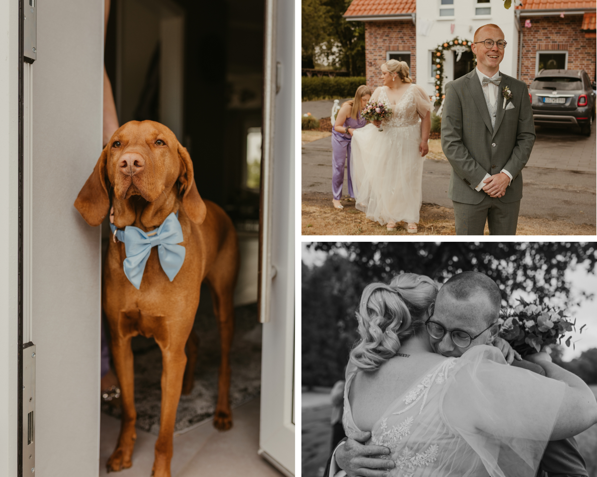Den First Look haben wir auf dem gegenüberliegenden Feld gemacht. Dabei flossen ganz viele Freudentränen und die beiden, genauso wie ihr Hund, waren überglücklich.