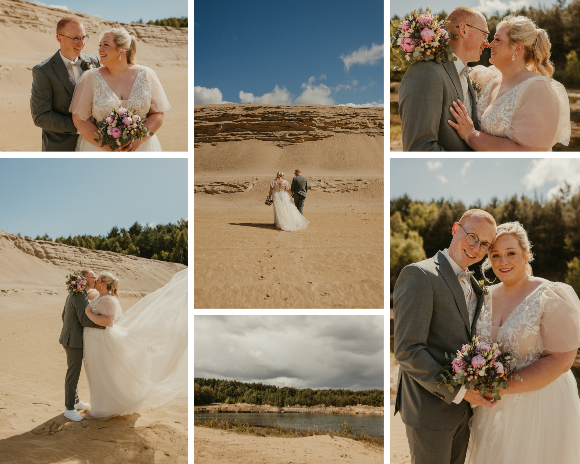 Nicht weit vom Zuhause von Sophie und Philipp entfernt gibt es ein wunderschönes Baggerloch. Wären die Bäume nicht, würde man meinen man wäre in der Wüste. Der Kontrast mit dem strahlend blauen Himmel war einfach nur schön. Genauso wie das Brautpaarshooting mit den beiden.