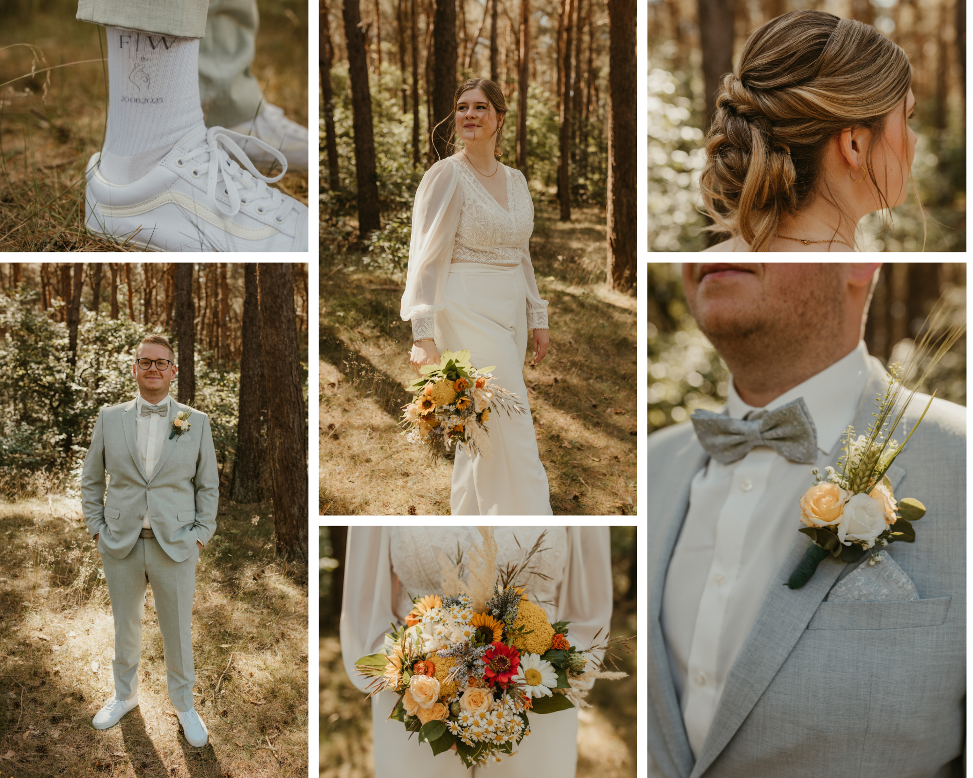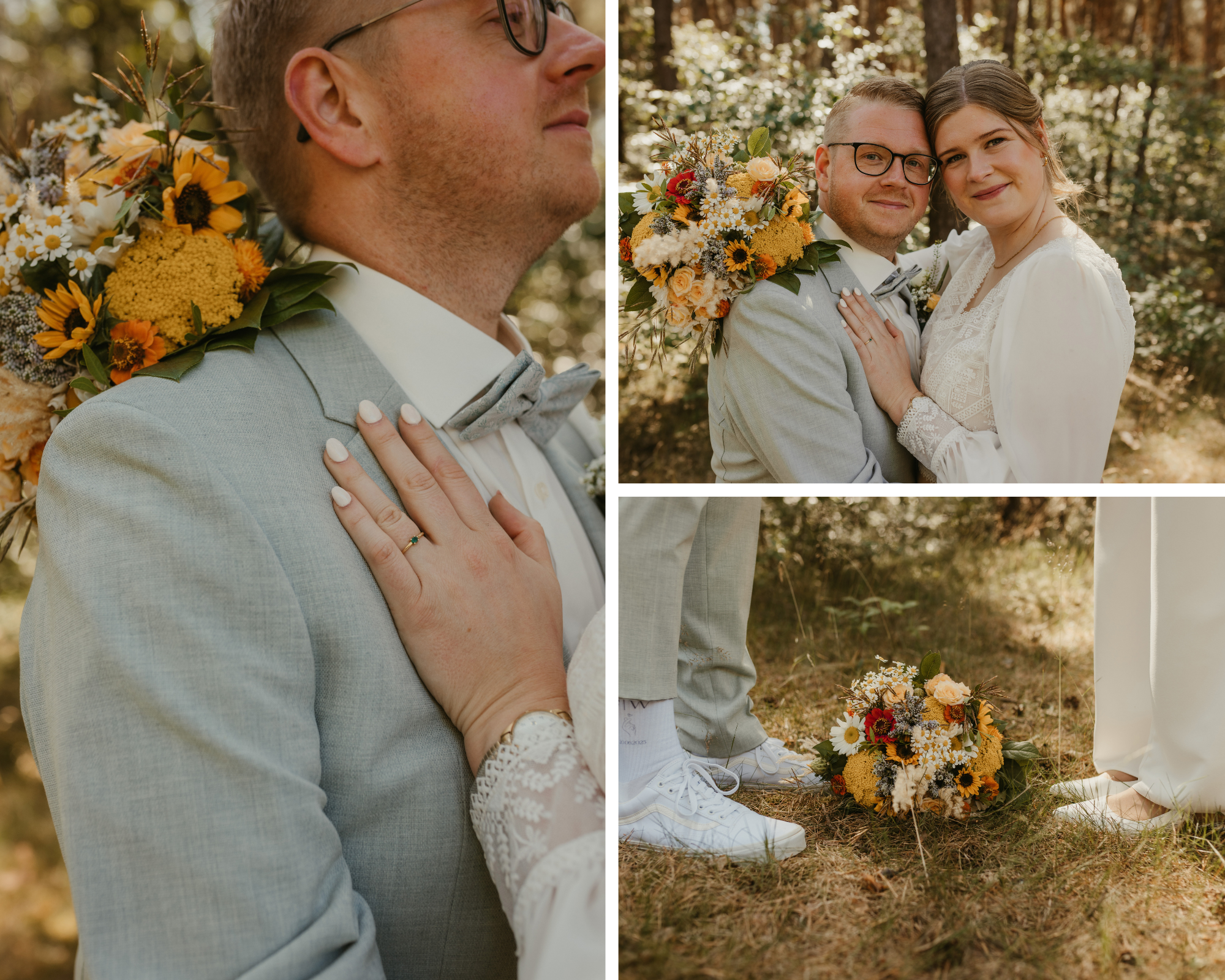 Zuerst habe ich all die kleinen Details, das heißt Brautstrauß, Ansteckblume des Bräutigams, Brautfrisur, und auch Socken fotografiert. Der First Look war wieder begleitet von einigen Emotionen. Danach haben wir mit dem Brautpaarshooting angefangen.