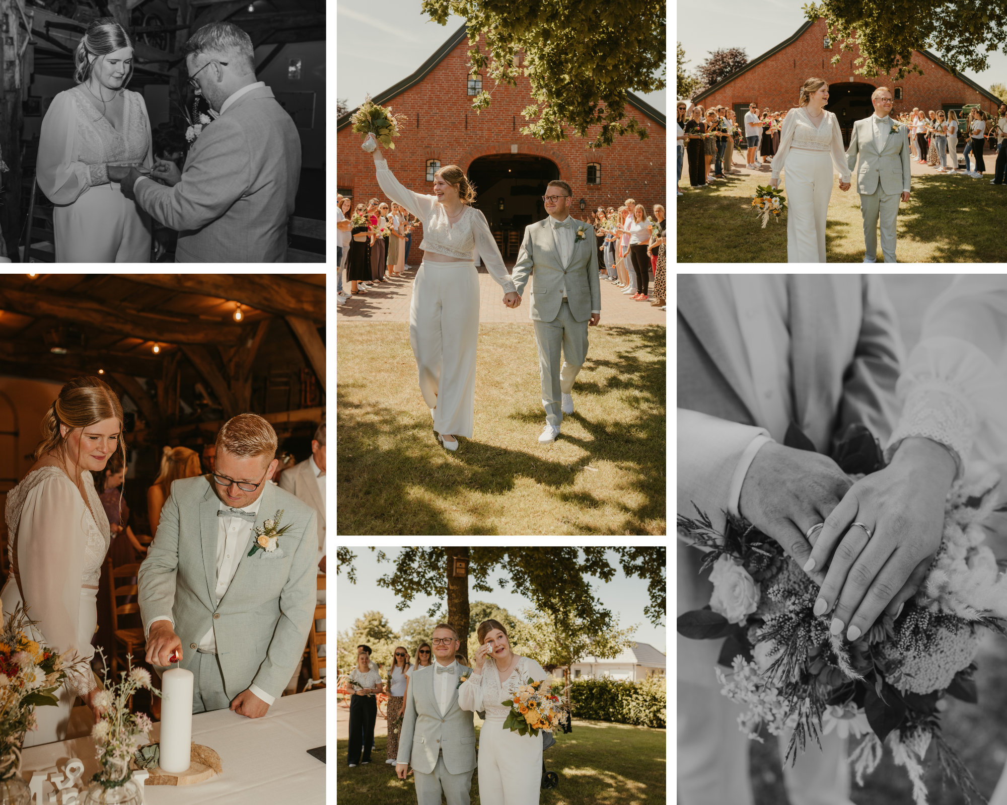 Nach einer emotionalen Trauung wurden die beiden von ihren Liebsten mit einem Spalier und lautem Jubel empfangen. Es folgten Gratulationen und Sektempfang und noch ein paar Gruppenfotos.